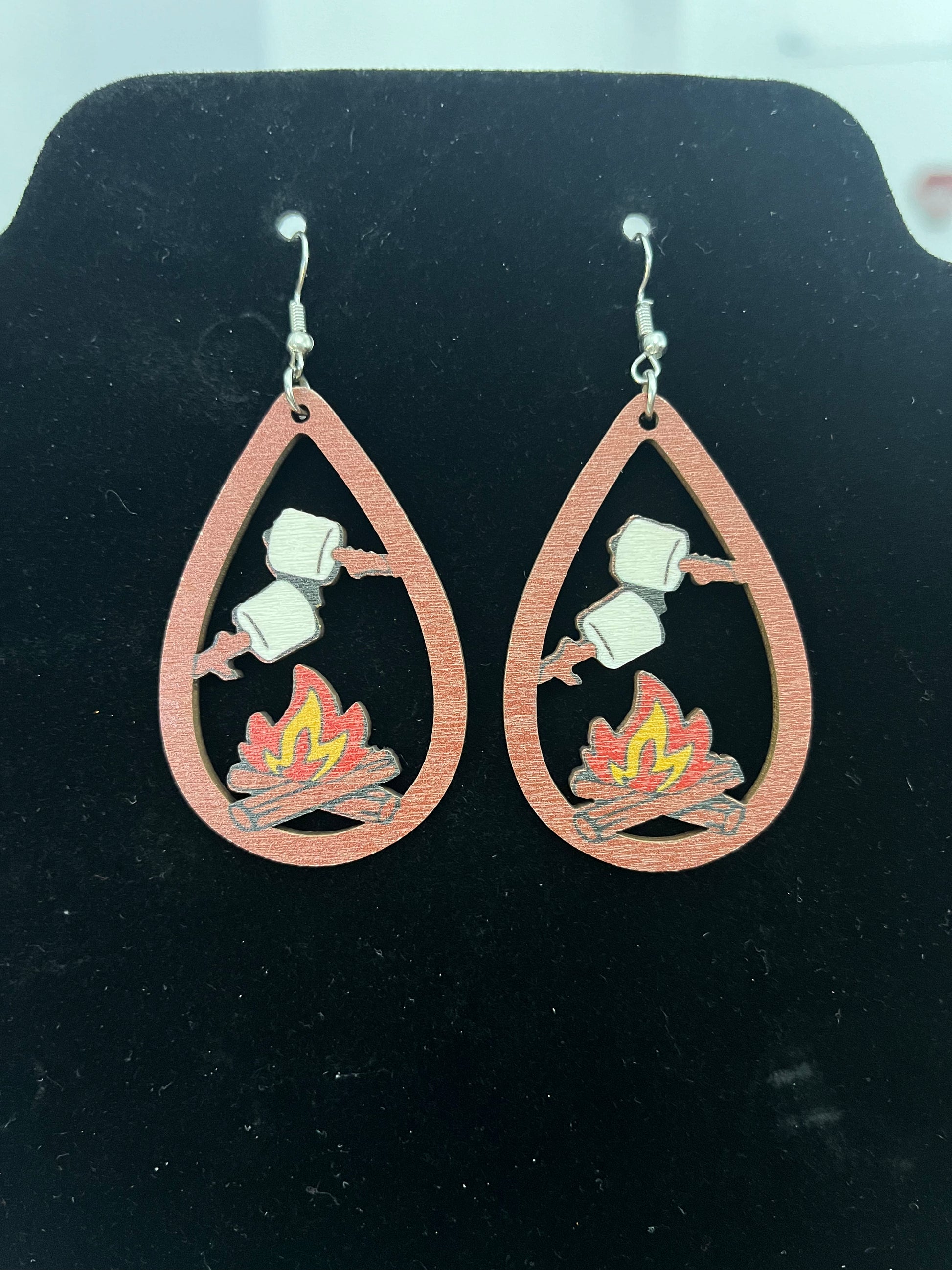 Super cute Bonfire and Marshmallows earrings. Expertly crafted with super lightweight wood, these earrings feature adorable marshmallow and bonfire designs. The perfect accessory for nature lovers and outdoor enthusiasts.