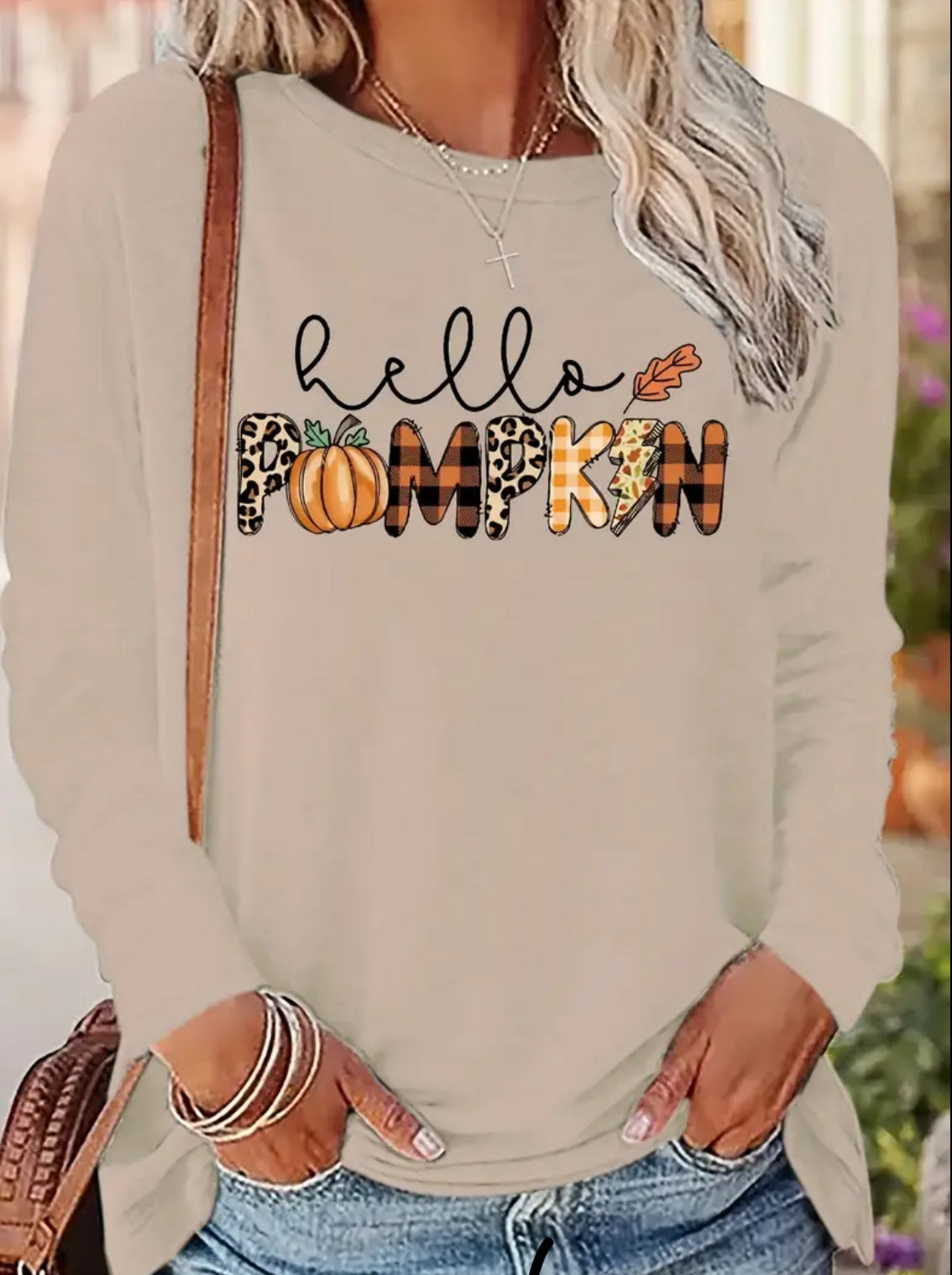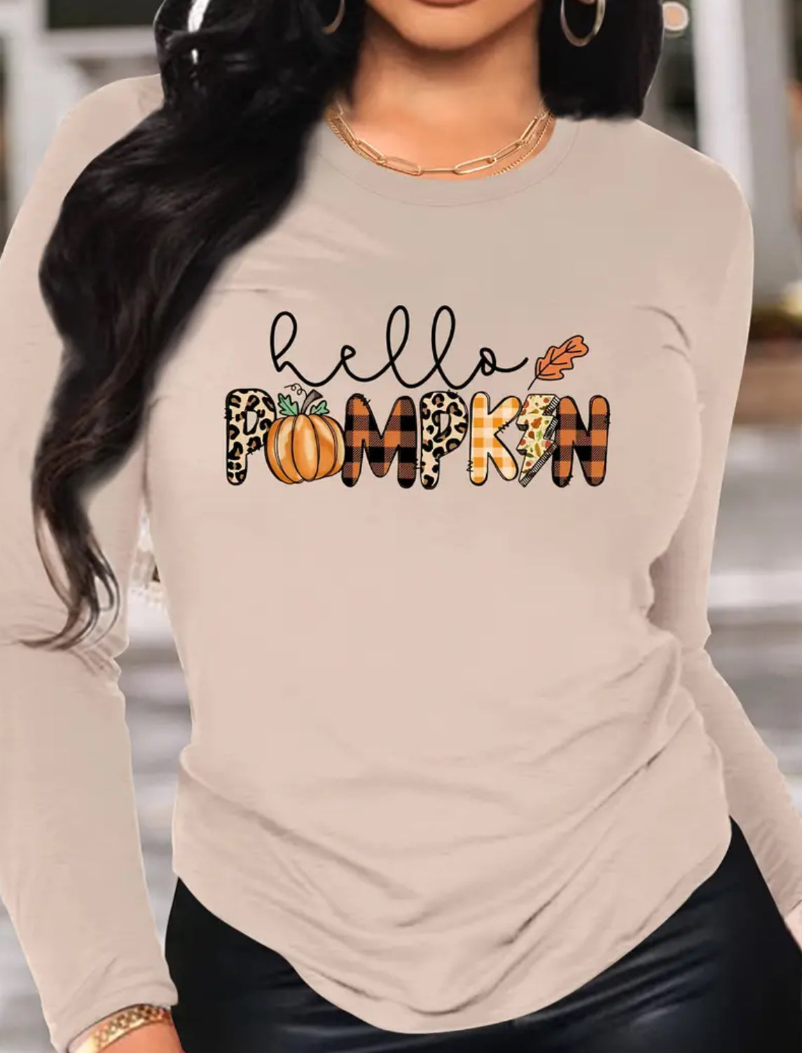 This long-sleeved shirt features a playful "Hello Pumpkin" design and is crafted from super soft fabric, perfect for the cooler autumn weather. Show off your festive spirit and stay comfortable this Thanksgiving. Wash inside out for long-lasting wear.